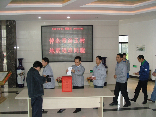 2010年4月14日青海玉樹(shù)發(fā)生里氏7.1級地震,災區的信息牽動(dòng)著(zhù)公司每個(gè)員工的心,公司員工陸續通過(guò)各種方式向地震災區表達自己的一份心意。4月21日舉國哀悼,下午4:00,公司組織員工對青海玉樹(shù)的同胞們進(jìn)行捐款,捐款前公司員工對地震中的遇難者進(jìn)行默哀。共有326人參與本次活動(dòng),所得善款共計15885元,善款將通過(guò)銅陵市紅十字會(huì )送達災區。